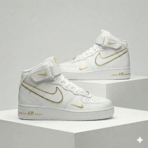 حذاء رياضي يجمع بين التصميم الكلاسيكي واللمسة العصرية، مناسب للاستخدام اليومي ويمنحك مظهراً أنيقاً ومريحاً في نفس الوقت. يتميز هذا الإصدار من Air Force بخامة متينة وتصميم مرتفع يوفر دعماً إضافياً للكاحل، مع تفاصيل ذهبية تضيف لمسة فخامة بسيطة.